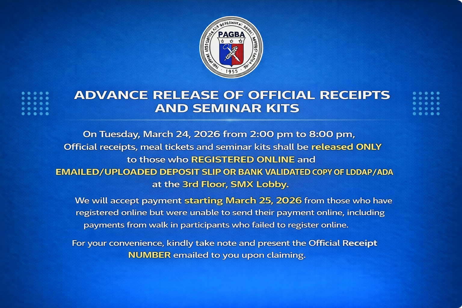 On Tuesday, March 24, 2026 from 2:00 pm to 8:00 pm, Official receipts, meal tickets and seminar kits shall be release ONLY to those who…
