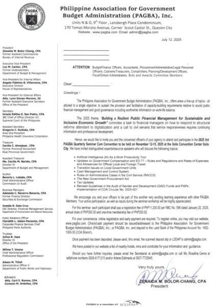 Download Invitation for 2025 3rd PAGBA Quarterly Seminar and Meeting to be held on November 12-15, 2025 at the Iloilo Convention Center, Iloilo City.